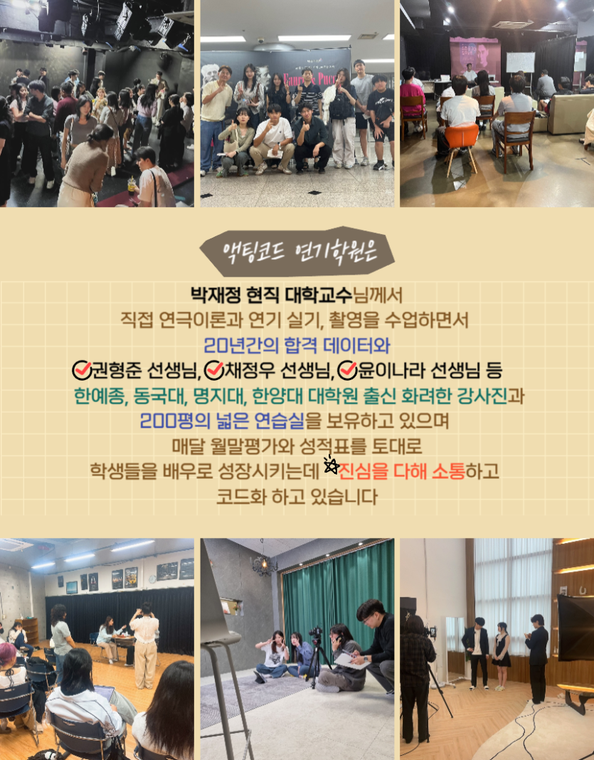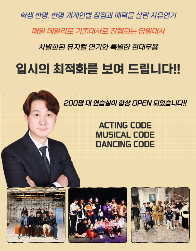 글보기제목액팅코드 소개 -연기학원 액팅코드 연기학원을 소개합니다. since .20202025-12-06 11:59카테고리공지사항작성자actingcode 태그 목록 댓글 [0] 더보기이전영상프로필 대회2025-12-06다음2026학년도 연극영화과 / 뮤지컬과 / 예고 합격자 모집2025-12-06 Powered by MangBoard | 망보드 스토어