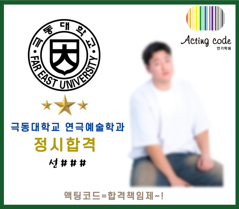 노력은 결코 배신하지 않는다는 것을 온몸으로 보여준 액팅코드의 자랑스러운 얼굴들입니다. 수많은 밤을 새워 연습하고, 끊임없이 자신을 단련하며 흘린 땀방울이 마침내 빛나는 합격증으로 돌아왔습니다.이들의 성공은 단순한 운이 아닌, 체계적인 시스템과 뜨거운 열정이 빚어낸 필연적인 결과입니다.최고를 꿈꾸는 당신, 최고의 선택은 언제나 액팅코드입니다. 제목극동대학교 연극예술학과 정시합격 - 선###2026-02-20 00:24작성자actingcode 목록 댓글 [0] 더보기이전경성대학교 뮤지컬과 정시합격 - 선우##actingcode 2026-02-20다음(예고입시반) 한지효-YY ENT 오디션 합격actingcode 2026-02-20 Powered by MangBoard | 망보드 스토어